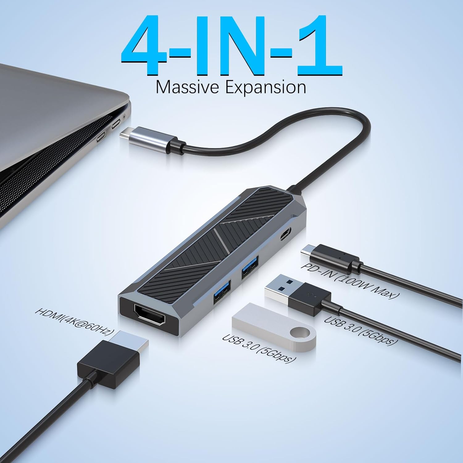 4-í-1 USB-C Hub með 4K 60Hz HDMI skerandi er fjölnota stækkunartæki sem tengist fartölvu, spjaldtölvu eða samhæfu tæki í gegnum USB-C tengi. Það breytir einni USB-C tengi í fjóra nauðsynlega tengimöguleika, venjulega þar á meðal HDMI skjáúttak og mörg USB gagnatengi.