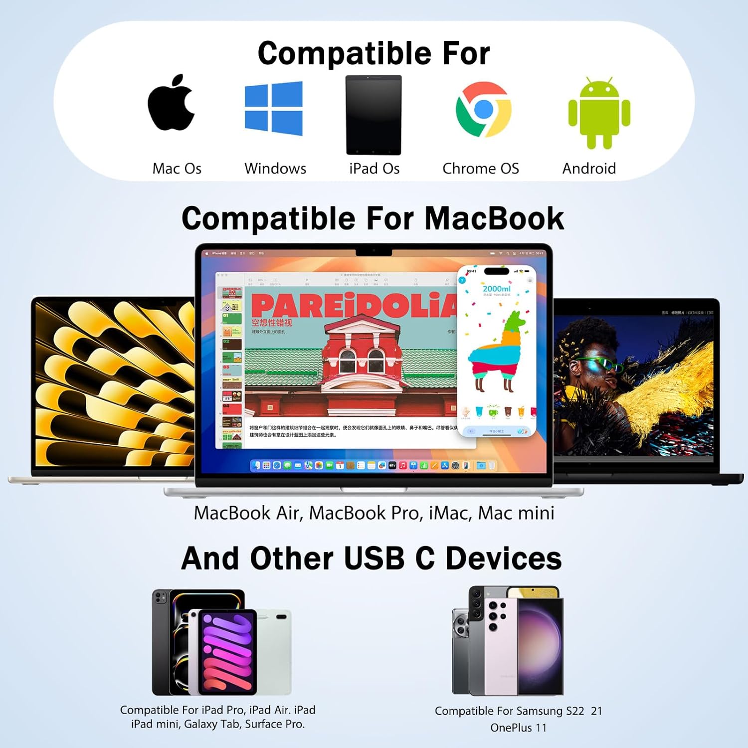 Samhæfni: USB-C fartölvur, spjaldtölvur og snjallsímar