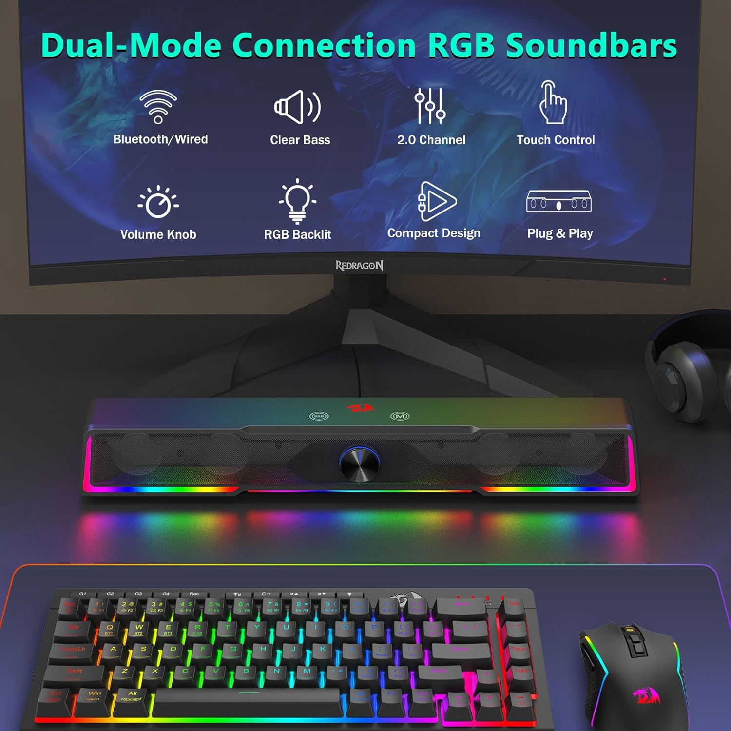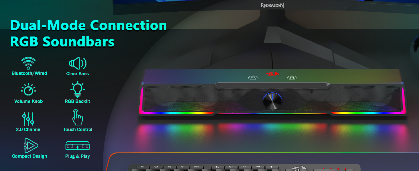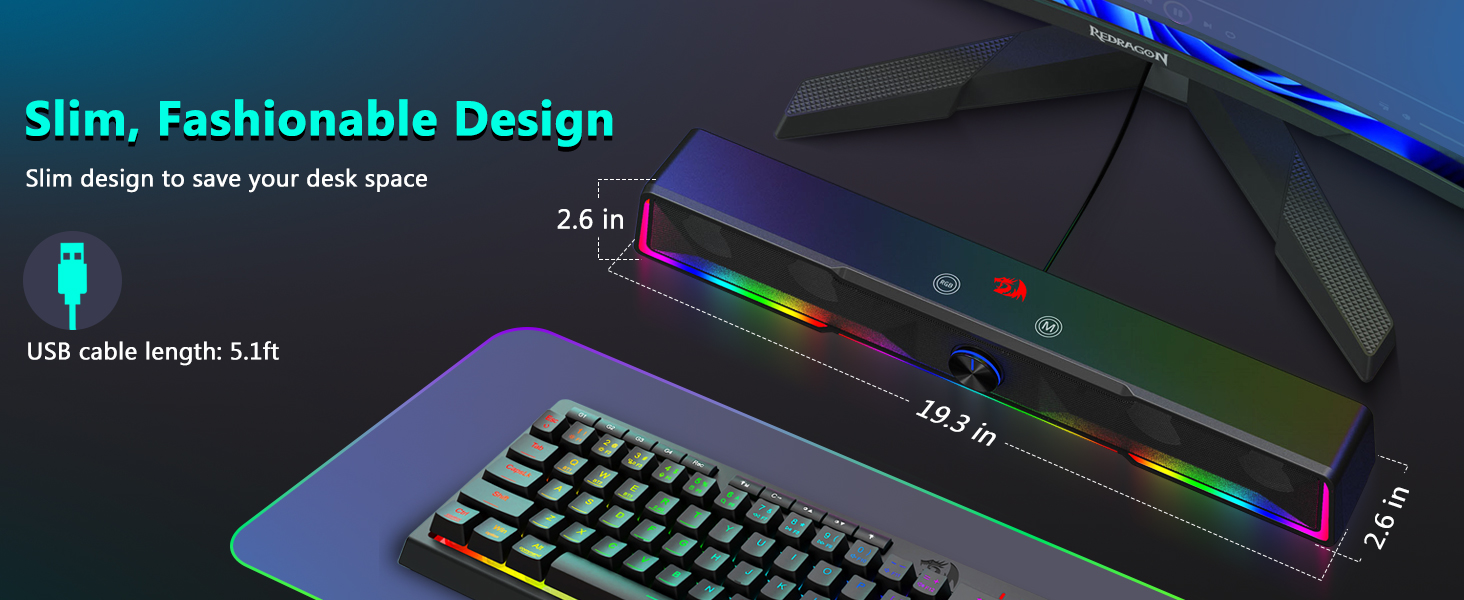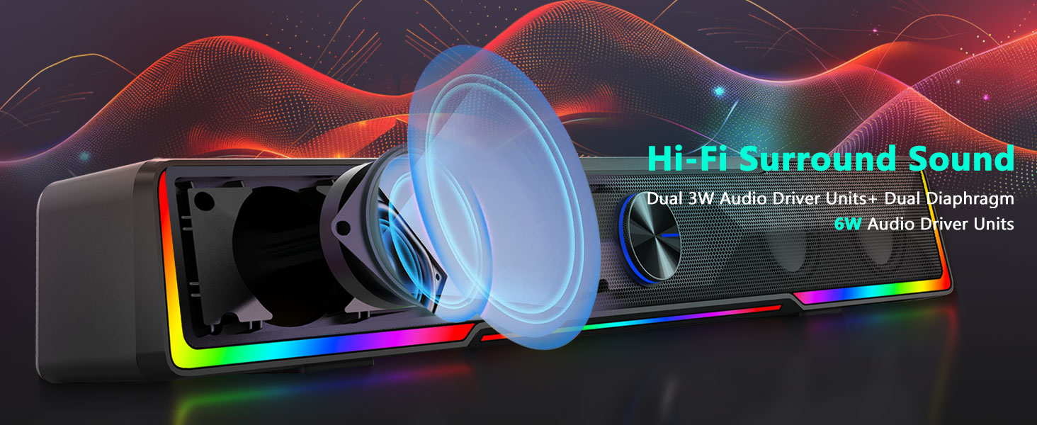 Samþætt uppbygging hljóðstikunnar gerir hátalaranum kleift að dreifa hljóðinu jafnt yfir skrifborðssvæðið, sem skapar breiðara hljóðsvið samanborið við hefðbundna samninga hátalara. Þessi hönnun eykur hlustunarupplifun fyrir tónlist, kvikmyndir, leiki og netfundi.