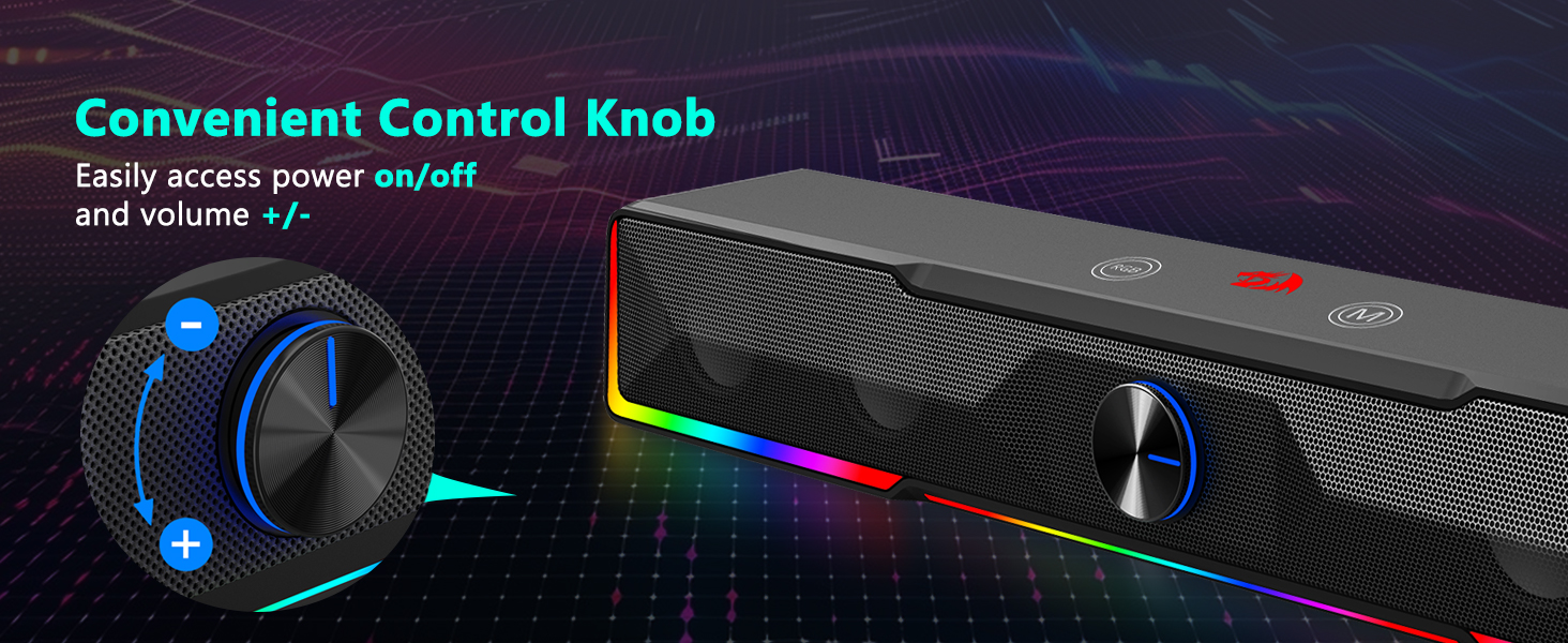 Innbyggði hljóðstyrkshnappurinn er einn af þægilegustu eiginleikum Black GS516 Bluetooth/USB Wired Connection Soundbar Volume Knob tölvuhátalara.