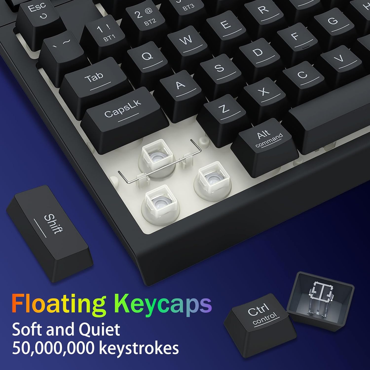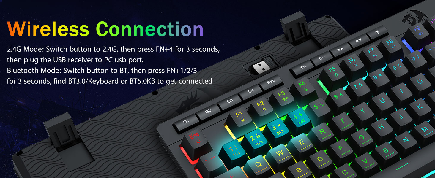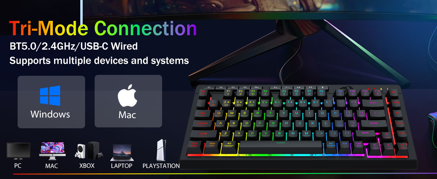 Tri-Mode fjölhæfni & Multi-Device leikni- Skiptu óaðfinnanlega á milli Bluetooth 5.0, 2.4GHz þráðlauss eða USB-C þráðlausrar stillinga, tengdu allt að 5 tæki samtímis (PC, Mac, spjaldtölvur, símar, PS/XBOX).