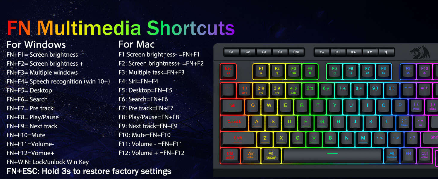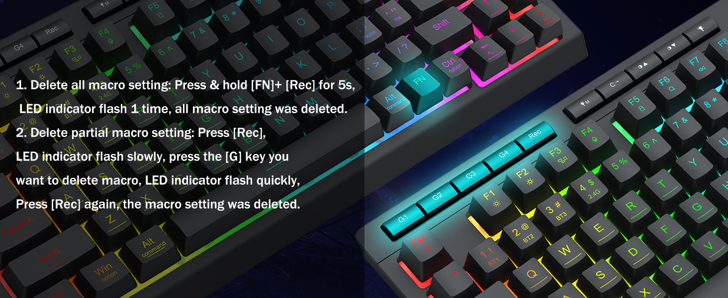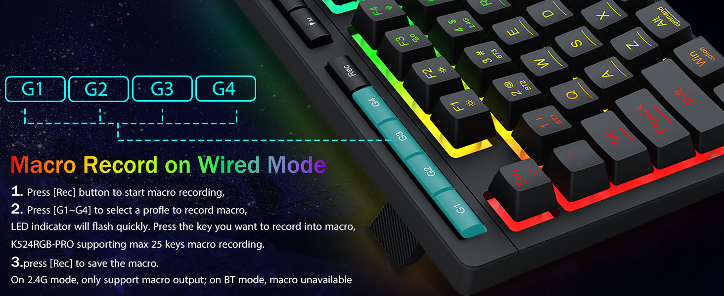 Sérhannaðar fjölvi, áreynslulaus stjórn- Forritaðu 4 makrólyklana um borð (G1-G4) samstundis—enginn hugbúnaður nauðsynlegur. Taktu upp flókin samsetningar fyrir leiki, flýtileiðir fyrir framleiðni eða miðlunarskipanir. Endurskilgreindu vinnuflæðið þitt á nokkrum sekúndum. Þú getur líka notað hugbúnað til að sérsníða aðgerðir, búa til fjölvi, stilla RGB ljós og stilla flýtileiðir.