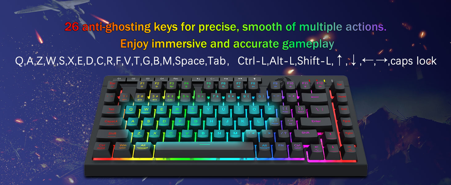 Pro-Grade leikjaárangur og sérstakar baklýsingastýringar- Er með lykla gegn draugum (lyklar með undirstrik) sem gera kleift að 26 lyklar virka samtímis fyrir hröð og nákvæm leiksvörun eins og þú ætlaðir þér. Hraðaðgangshnappar fyrir birtustig, lýsingarstillingu og leikjastillingu til að stilla birtustig, lýsingarsnið á fljótlegan hátt og virkja leikstillingu með því að ýta á hnapp.