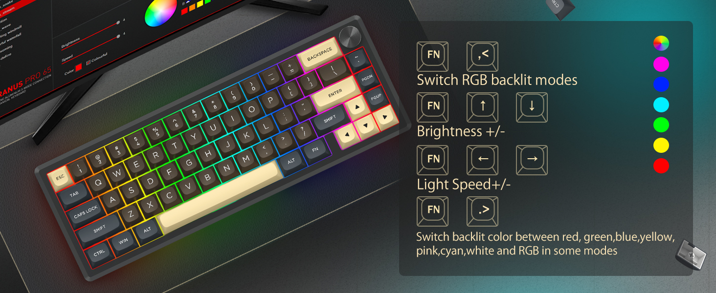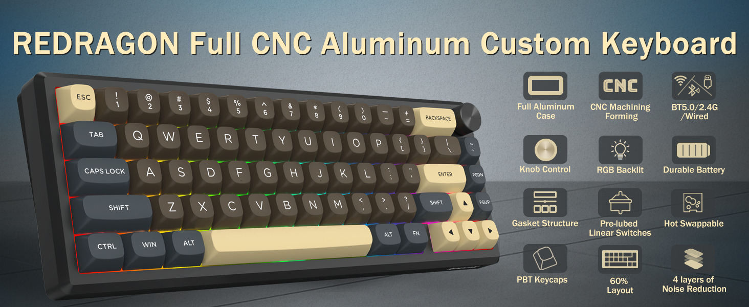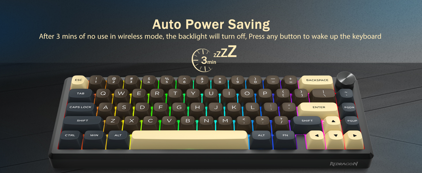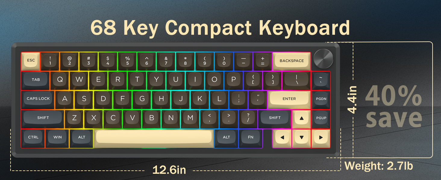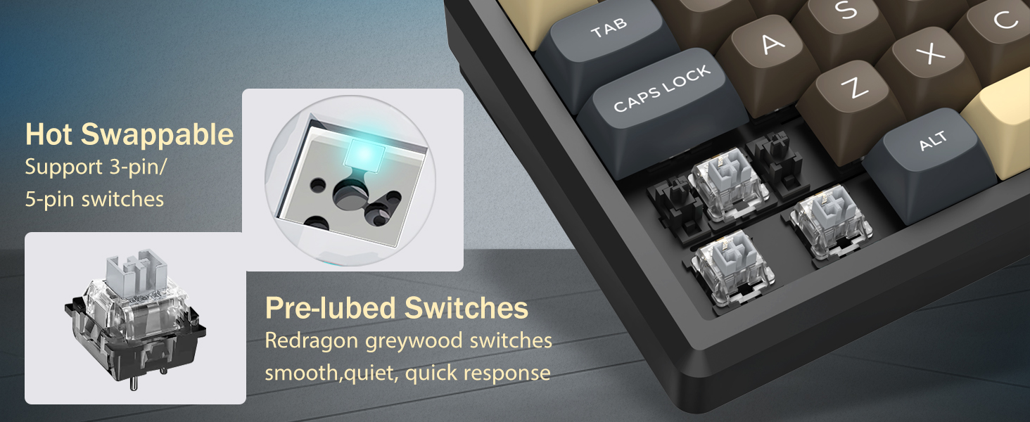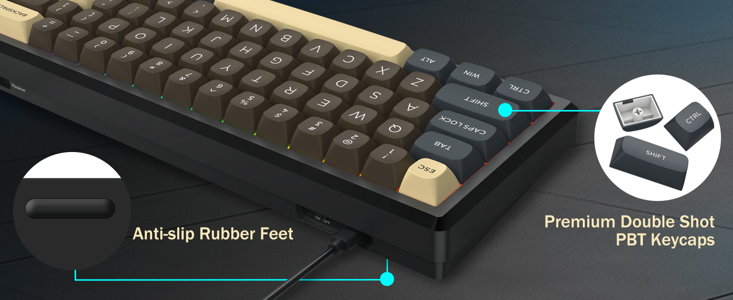 Með 60% uppsetningu, fjarlægir þetta lyklaborð ónauðsynlega lykla á meðan það heldur kjarnavirkni með takkasamsetningum. Þessi hönnun hjálpar til við að draga úr ringulreið á skrifborðinu og veitir meira pláss fyrir músarhreyfingar, sem gerir það hentugt fyrir bæði leikja- og framleiðniumhverfi.