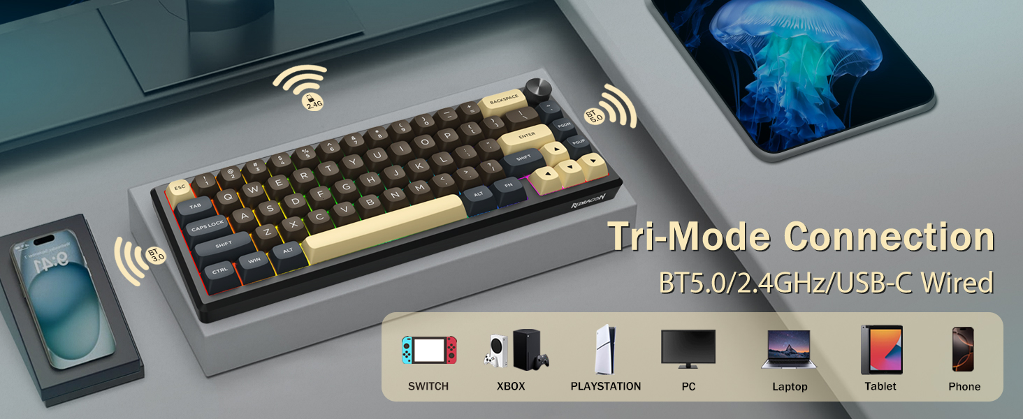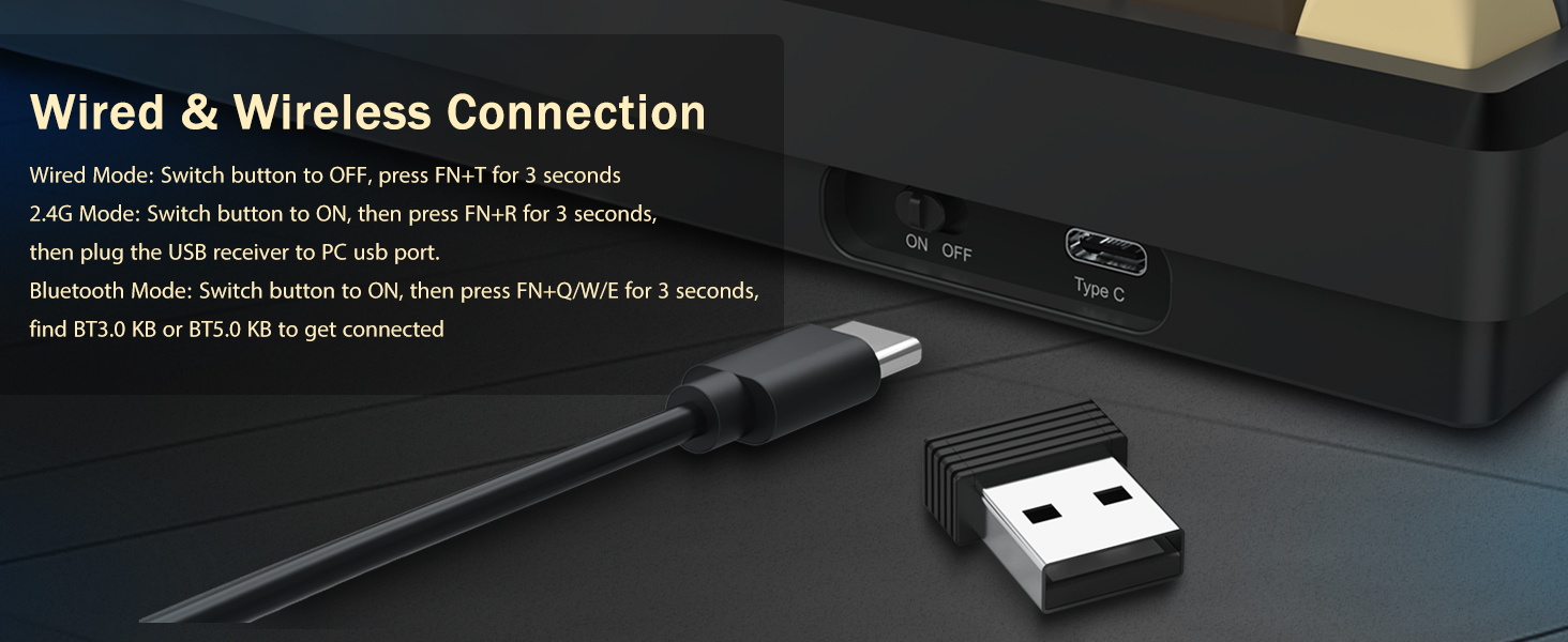 Lyklaborðið styður þráðlausa tengingu til þæginda og USB tengingu með snúru fyrir stöðugan árangur. Notendur geta skipt á milli stillinga eftir uppsetningu þeirra.