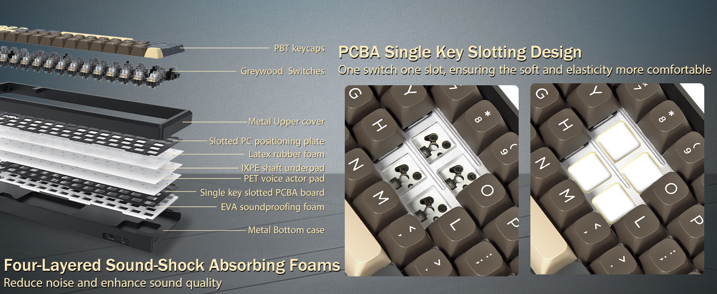 Lyklahúfur eru hannaðar fyrir endingu og stöðuga áferð, sem hjálpa til við að viðhalda þægilegri innsláttarupplifun með tímanum. Lyklaborðsramminn veitir stöðugleika við notkun, dregur úr hreyfingum við vélritun eða leikjalotur.