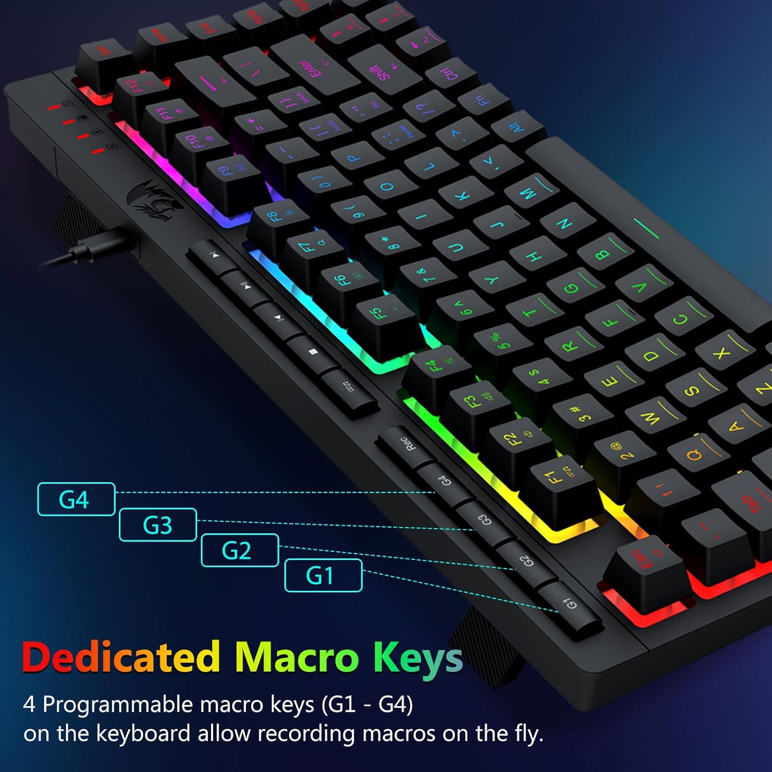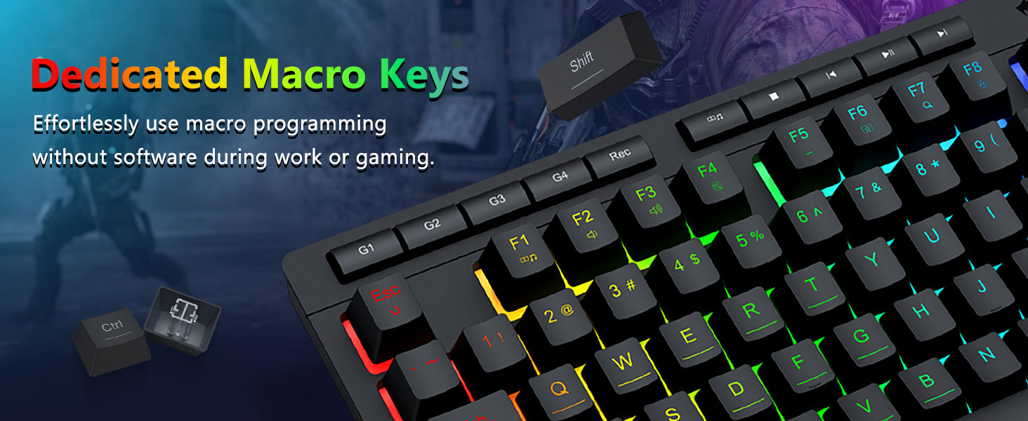 【Duglegur og þægilegur】Þetta samsetta lyklaborð og mús er búið 4 innbyggðum makrólykla, 5 sjálfstæðum margmiðlunartökkum og 12 FN margmiðlunaraðgerðatökkum, einfaldur og þægilegur í notkun. Það bætir ekki aðeins skilvirkni heldur gerir leikferlið þitt þægilegra og hraðari