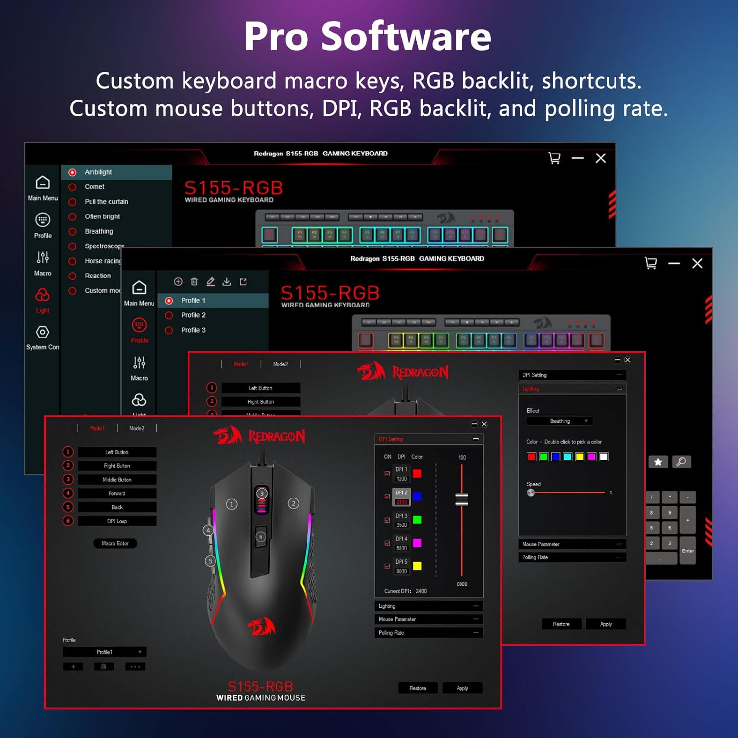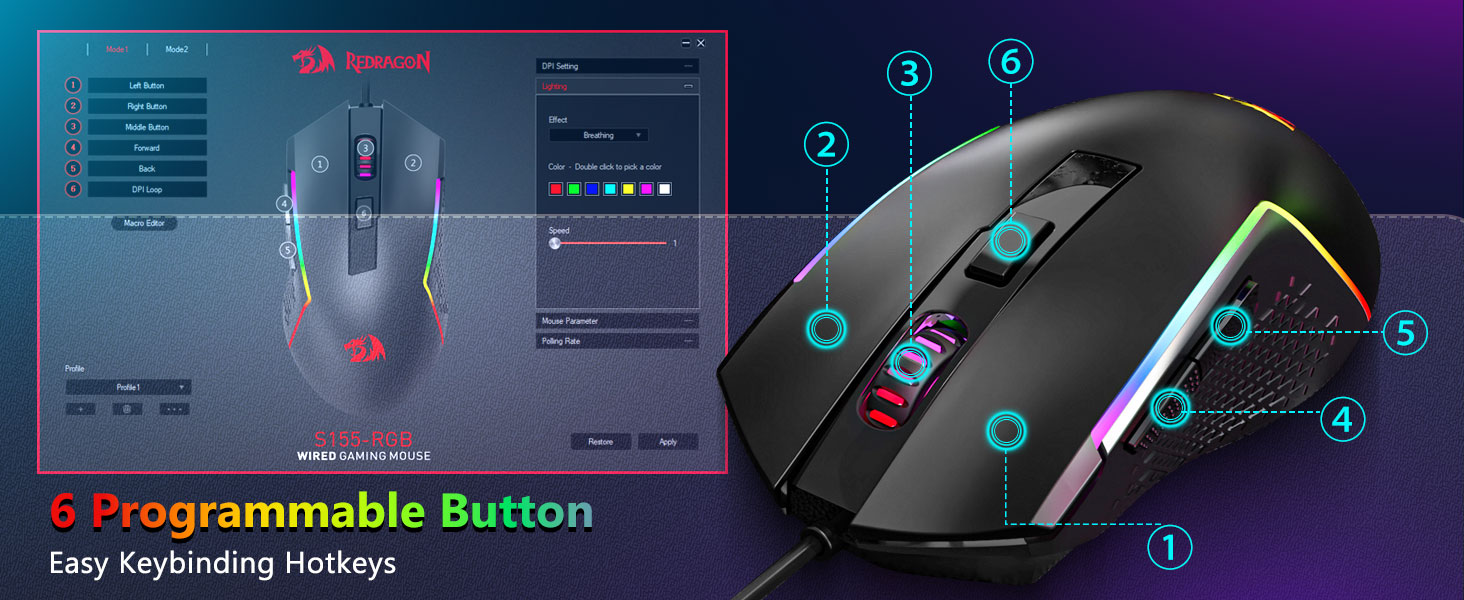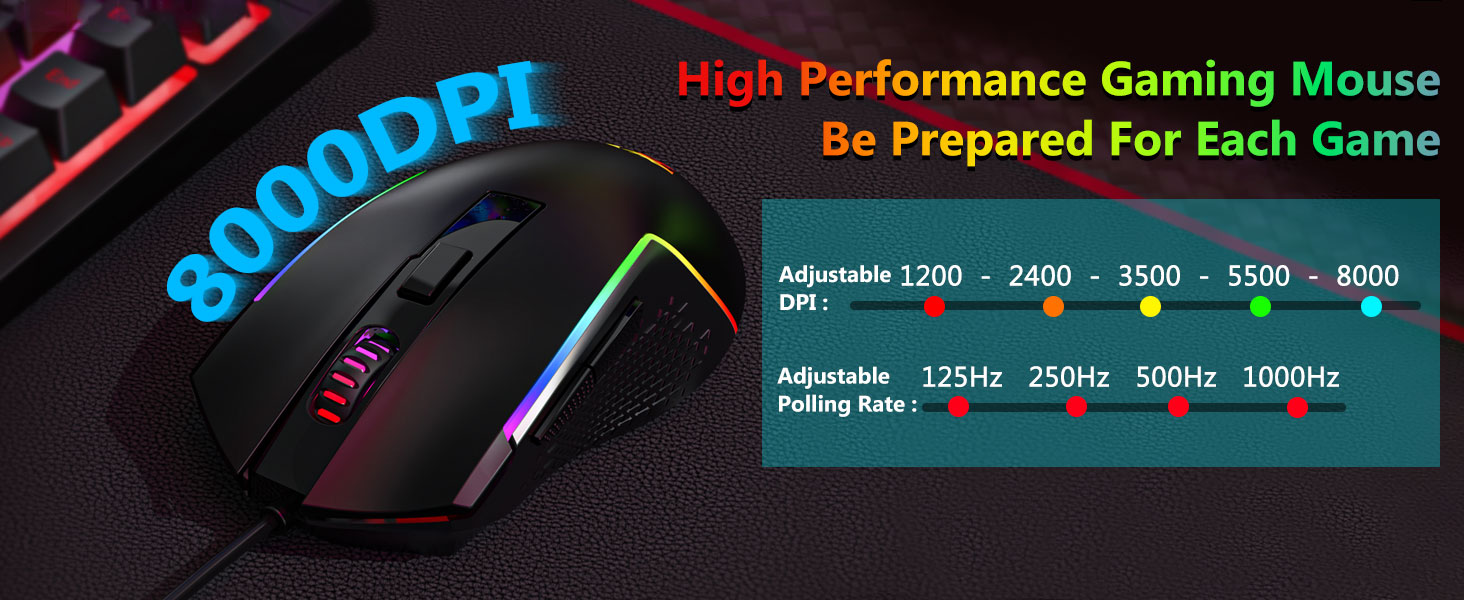 【RGB leikjalyklaborð og mús】Þú getur stillt DPI frá 1200 til 8000 með DPI hnappinum eða frá 100 til 8000 í gegnum hugbúnaðardrifinn til að mæta mismunandi þörfum þínum í leikjum eða vinnu auðveldlega. Samtals 7 hnappar þar af 6 forritanlegir. Hánákvæmni skynjarinn skilar nákvæmni á meðan leikjagráða örrofarnir tryggja langlífi, meiri endingu og mikla svörun, sem gefur þér enn meiri forskot á samkeppnina þína. (Hugbúnaðurinn styður einnig að stilla könnunartíðni músarinnar upp í 1000Hz)
