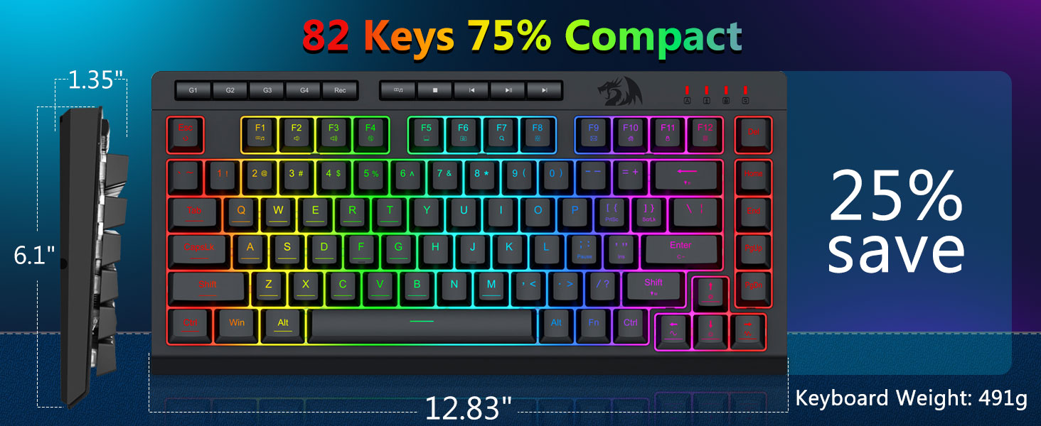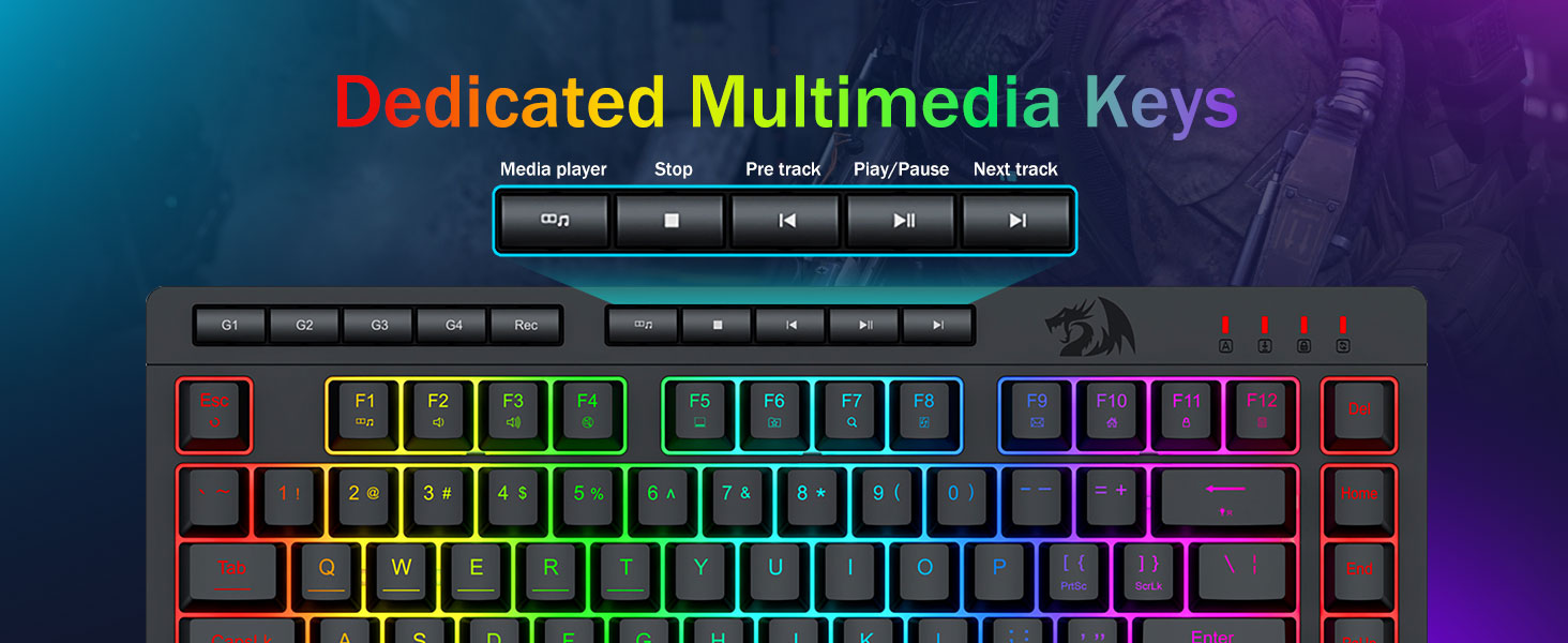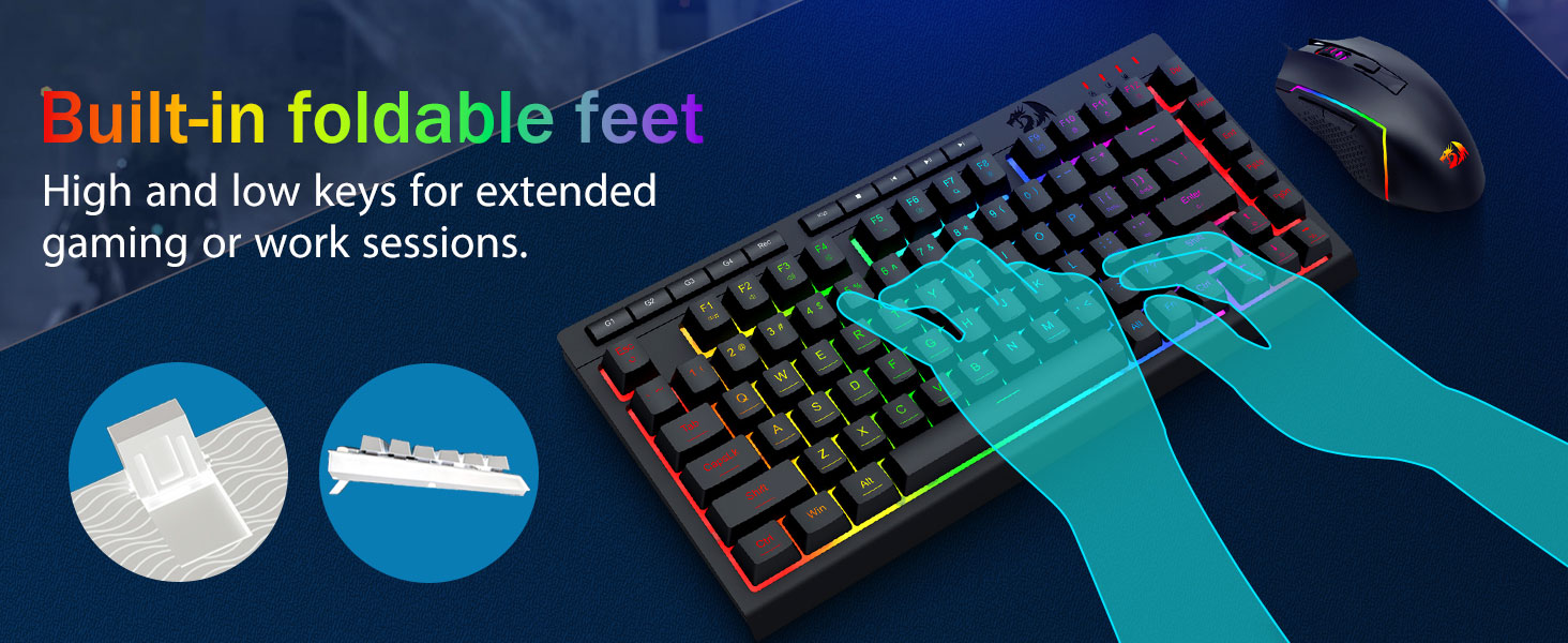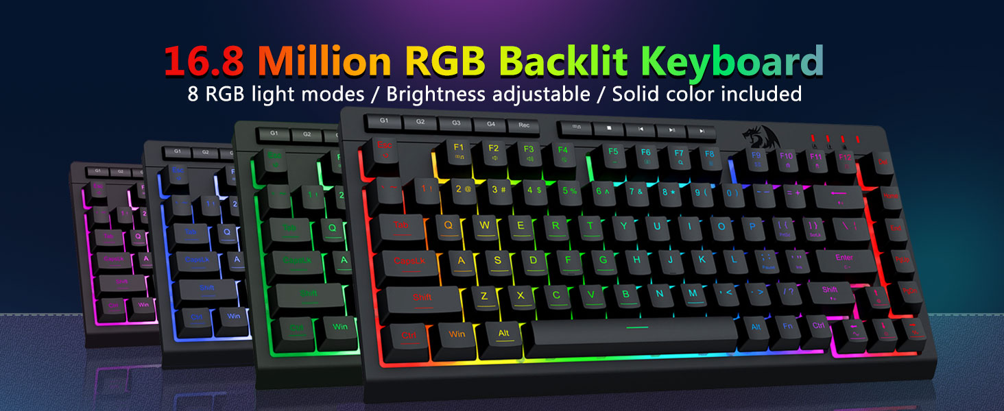 【RGB leikjalyklaborð og mús】Leikjalyklaborðið hefur 8 RGB lýsingarstillingar til að velja úr og leikjamúsin hefur 8 ljósaáhrif til að skipta á milli, og hægt er að stilla lyklaborðið fyrir 4 stiga hraða og birtu til að henta þínum óskum. Lyklatapparnir bjóða upp á skýra samræmda baklýsingu. Hvort sem settið er eitt ljós, breytileg ljósáhrif eða ekkert ljós, þá mun Redragon leikjalyklaborðið og músin uppfylla þarfir þínar!