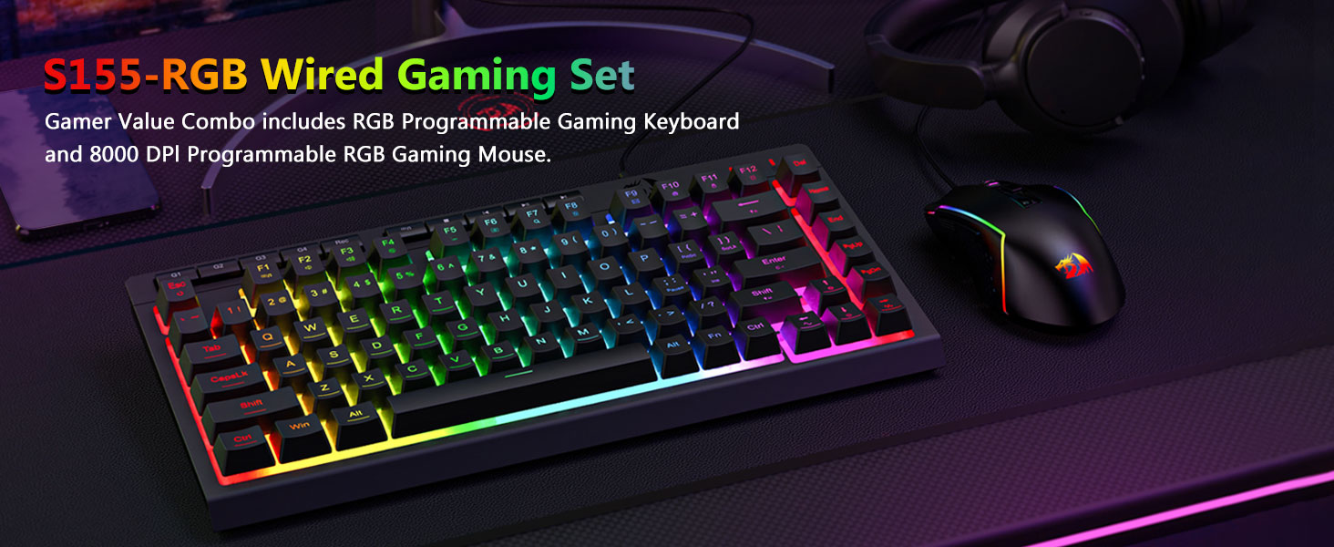 Svart S155 RGB baklýst leikjalyklaborð og mús með snúru