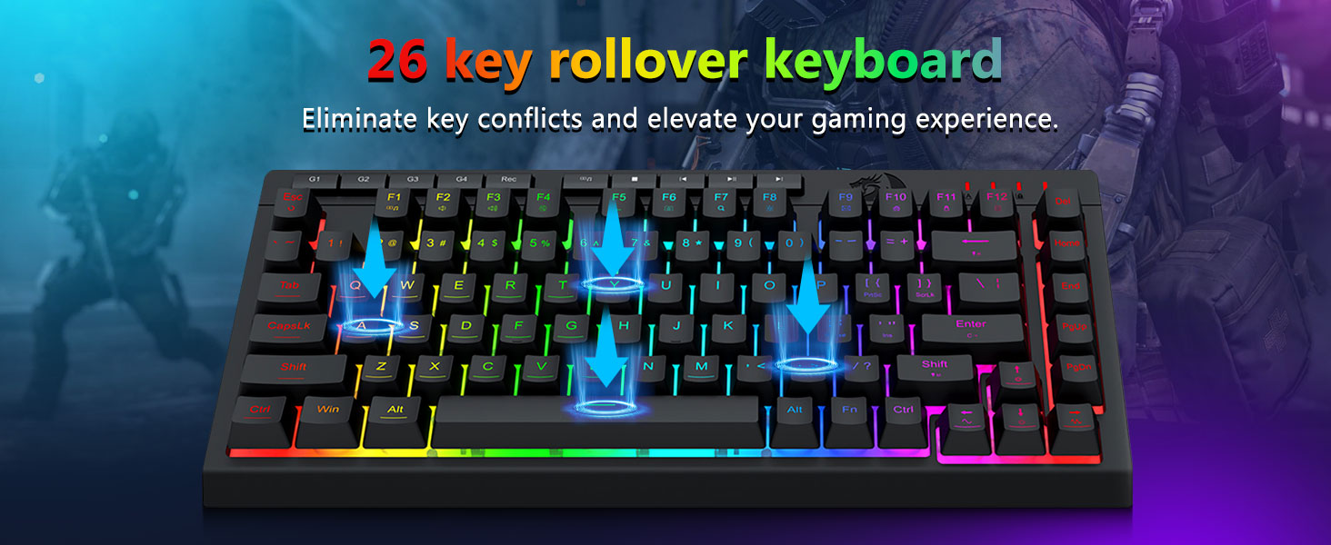 【Þægileg spilamennska】Sambrjótanlegur standur lyklaborðsins, húðvæn húðun og fljótandi lyklahúfur auka innsláttarþægindi. 26 lyklar gegn draugum tryggir að hægt sé að kveikja á hverjum hnappi. Hægt er að slökkva á WIN lyklinum fyrir leiki. Þetta lyklaborð og mús eru tileinkuð því að veita skilvirka leikupplifun á sama tíma og þau tryggja hámarks þægindi