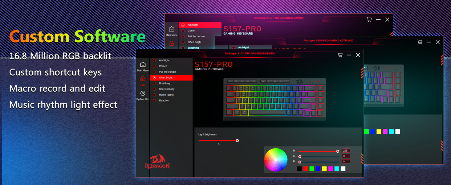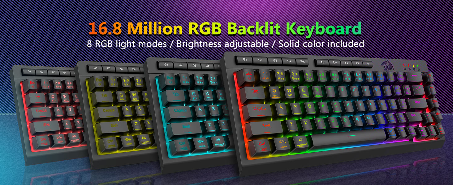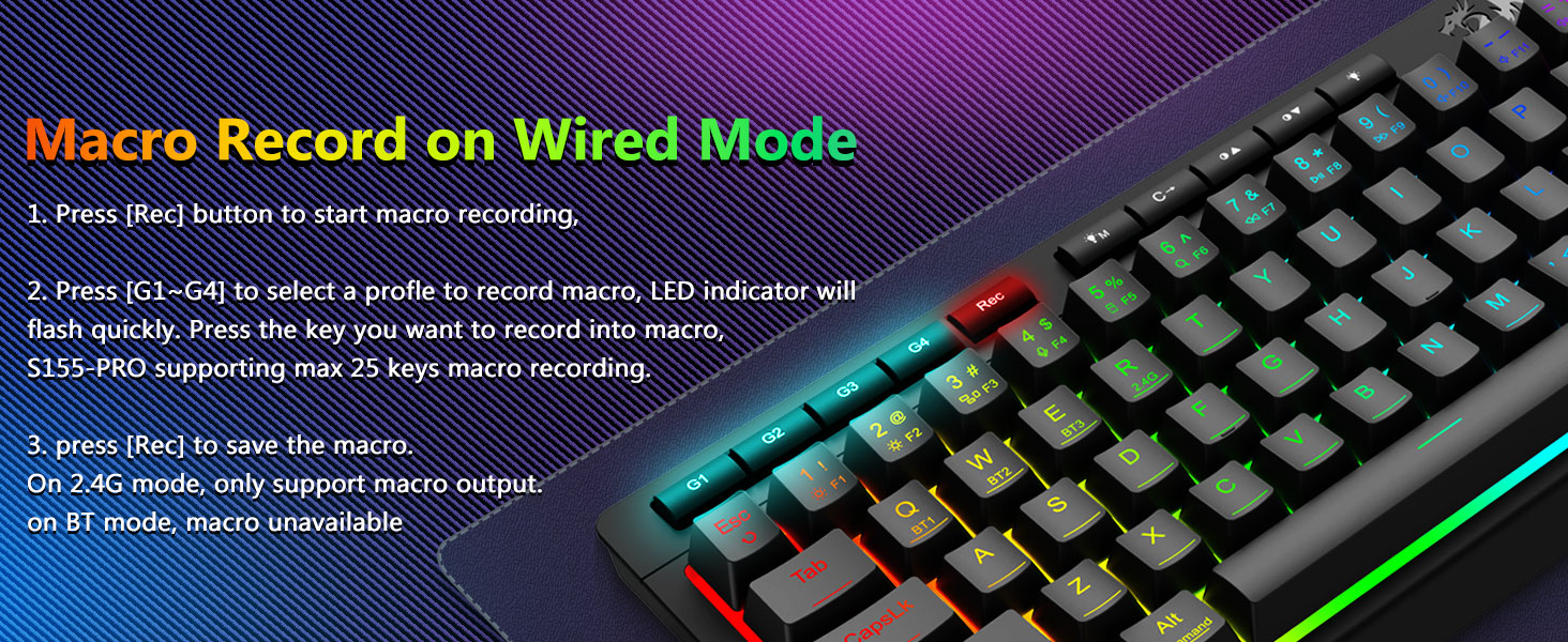 Sérhannaðar fjölvi, sérstakar baklýstar stjórntæki- Forritaðu 4 makrólyklana um borð (G1-G4) samstundis—enginn hugbúnaður nauðsynlegur. Taktu upp flókin samsetningar fyrir leiki, flýtileiðir fyrir framleiðni eða miðlunarskipanir. Endurskilgreindu vinnuflæðið þitt á nokkrum sekúndum. Þú getur líka notað hugbúnað til að sérsníða aðgerðir, búa til fjölvi, stilla RGB ljós og stilla flýtileiðir. Er með lykla gegn draugum (lyklar með undirstrik) sem gera kleift að 26 lyklar virka samtímis fyrir hröð og nákvæm leiksvörun eins og þú ætlaðir þér. Hraðaðgangshnappar fyrir birtustig, lýsingarstillingu og leikjastillingu til að stilla birtustig, lýsingarsnið á fljótlegan hátt og virkja leikstillingu með því að ýta á hnapp.