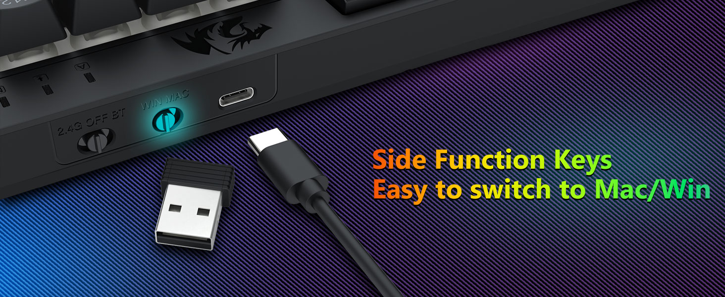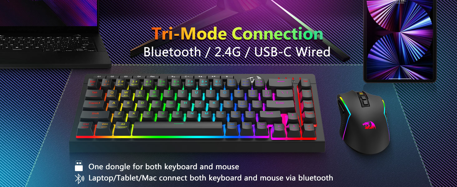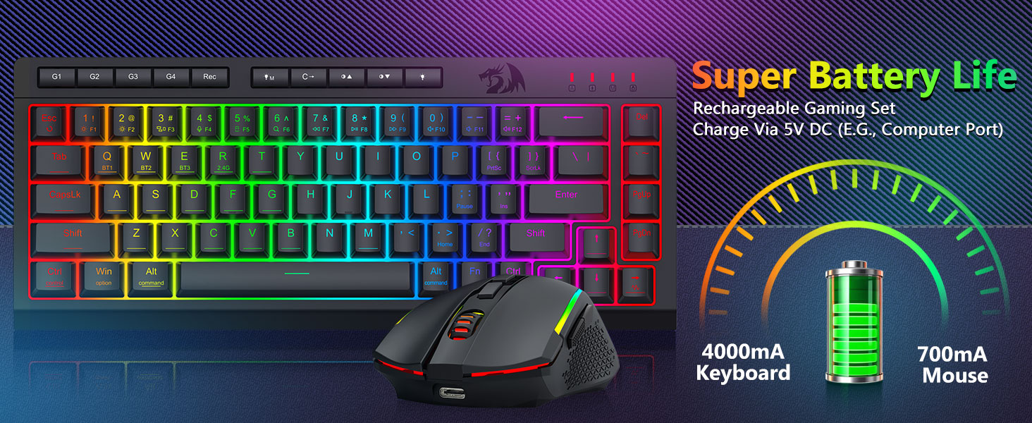 Max 12800 DPI Stillanleg- Skiptu óaðfinnanlega á milli Bluetooth 5.0, 2,4GHz þráðlauss eða USB-C þráðlausra stillinga, tengdu við mismunandi tæki (PC, Mac, spjaldtölvur, síma, PS/XBOX). Skiptu áreynslulaust um tæki með flýtilykla eða hliðarhnappi — fullkomið fyrir blendingavinnu/leikjauppsetningar. Haltu kraftinum í margar vikur með 4.000mAh rafhlöðulyklaborðinu og 700mAh rafhlöðumúsinni (30+ daga biðstaða, 50klst. RGB keyrslutími).