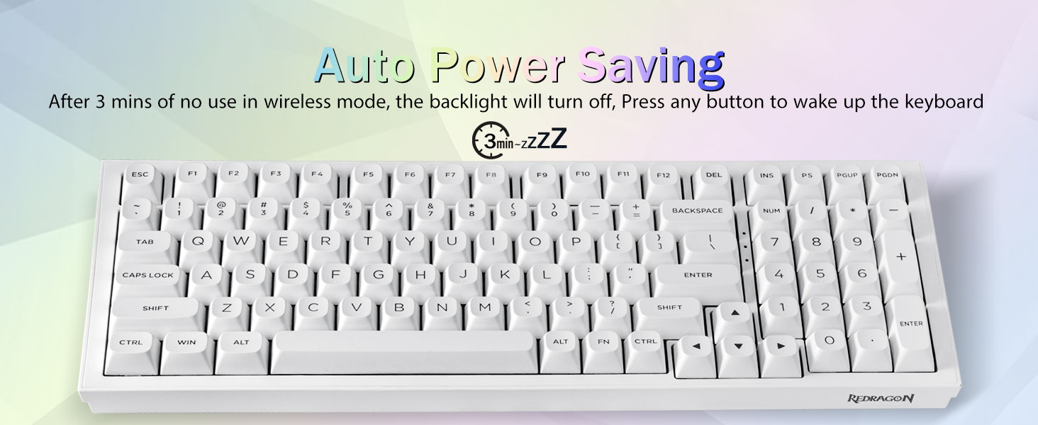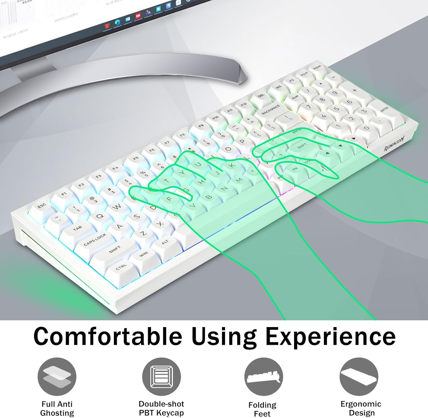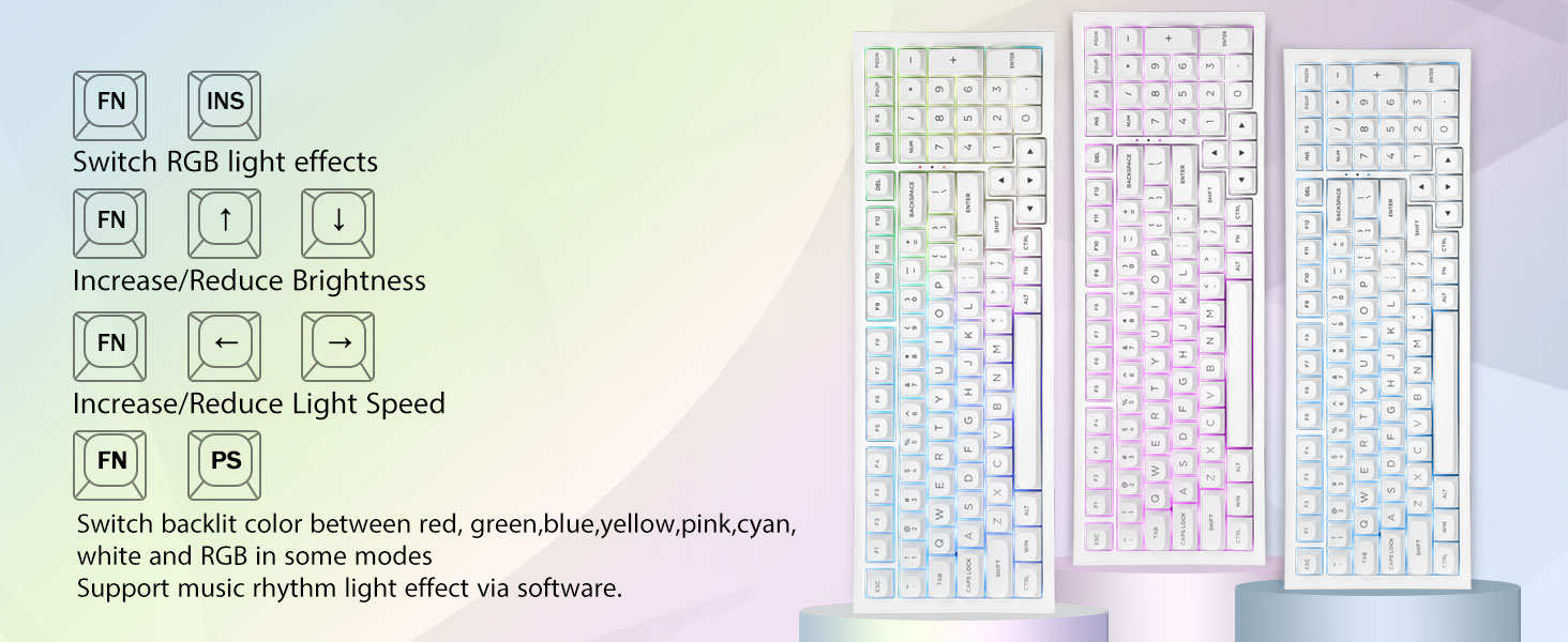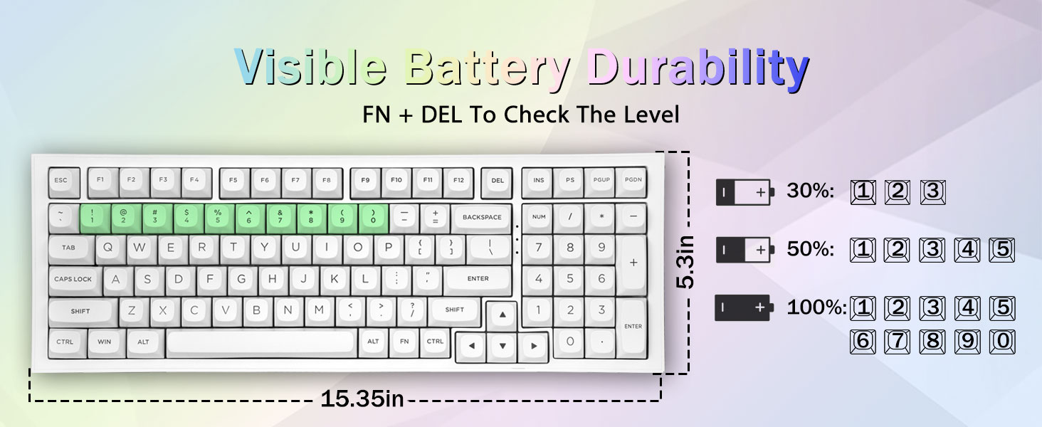 PBT lyklalok og 4000mAh rafhlaða:99 lyklar 96% útlit fyrirferðarlítið lyklaborð getur sparað meira pláss á skjáborðinu en geymt nauðsynlega örvatakka og númerasvæði fyrir leiki og vinnu. Endurhlaðanlega lyklaborðið innbyggt 4000mAh stór rafhlaða til að veita meiri kraft og lengri endingu rafhlöðunnar. Tvöföld PBT lyklahúfur, gerðar úr tveimur litum efni mótað inn í hvert annað, gera lyklahúfur stafi viðhalda lifandi og mettun, skýr og ekki hverfa.