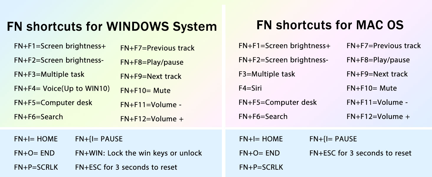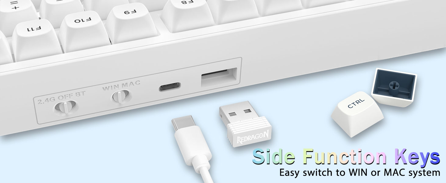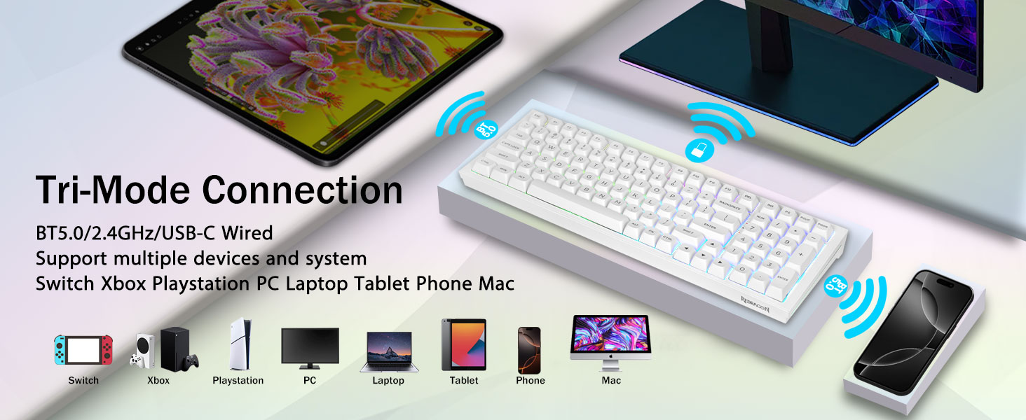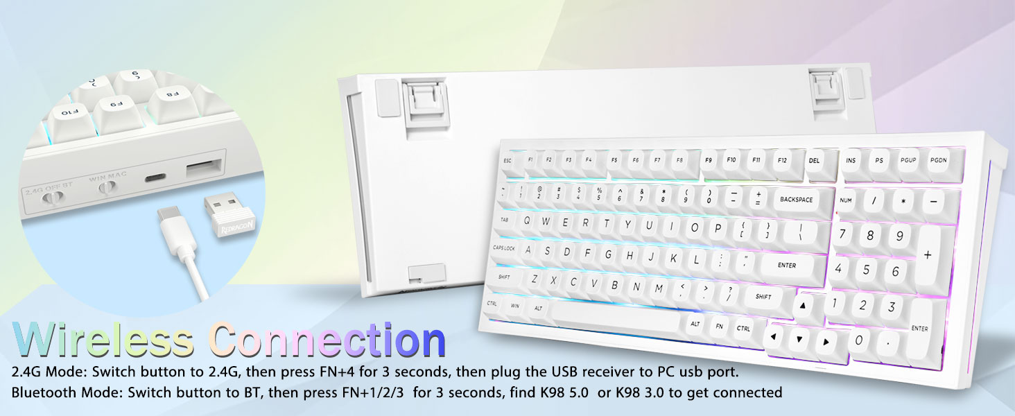 Fjöltækjatenging:Redragon K723 þráðlaust vélrænt lyklaborð býður upp á þrjár tengiaðferðir, þar á meðal BT5.0, 2,4GHz þráðlausa stillingu og USB hlerunarbúnað. Hægt er að tengja það við allt að fimm tæki á sama tíma og skipta á milli þeirra auðveldlega með FN og lyklasamsetningartökkum. Engin takmörk varðandi lyklaborðstenginguna þína til að mæta þörfum vinnu, leikja og náms.