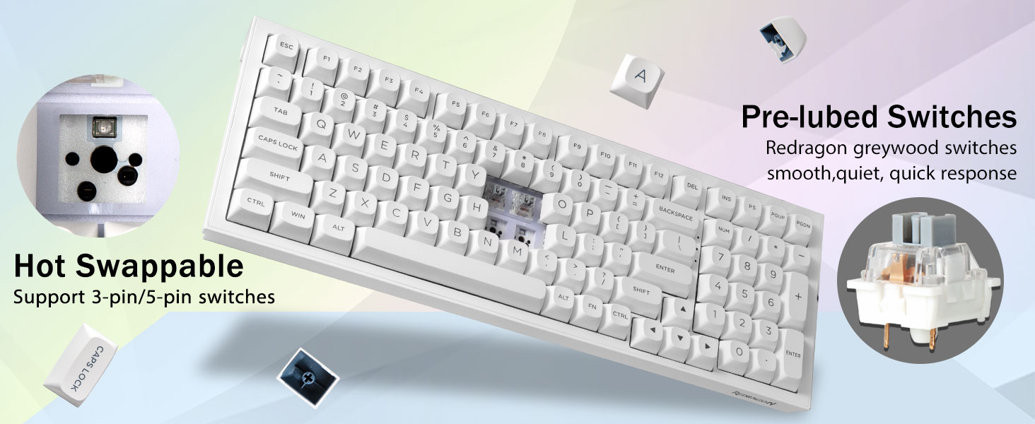 Sérsniðið lyklaborð sem hægt er að skipta um:Hægt er að skipta um rofa og lyklahúfur að vild (lyklahúfur/rofadráttarvél er innifalinn í pakkanum). Þetta sérhannaða lyklaborð með heitt skipta PCB gerir notendum kleift að skipta um 3 pinna/5 pinna rofa auðveldlega án lóðunarvandamála. K723 vélræn lyklaborð búin fyrirfram smurðum línulegum rofum, gefa mjúka innsláttartilfinningu og skemmtilegt innsláttarhljóð, veita hröð svörun fyrir spennandi leik