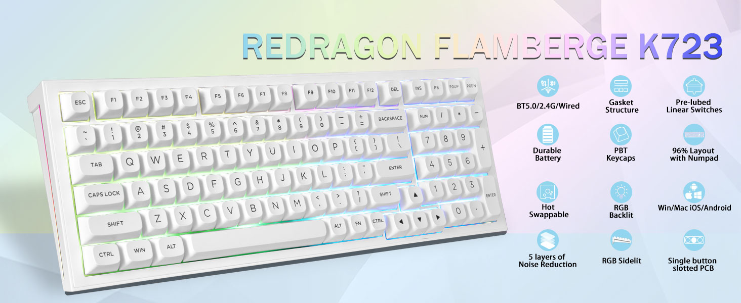 Chuangquan, leiðandi kínverskur framleiðandi, kynnir með stolti Redragon White Creamy K723 þráðlaust vélrænt leikjalyklaborð - meistaraverk hannað fyrir spilara sem neita að gera málamiðlanir! Með ljómandi hröðum tengingum fyrir marga tækja, aðlögun sem hægt er að skipta um með heitum hætti og þéttingu fyrir smjörsléttar áslátt, skilar þetta lyklaborð óviðjafnanlega frammistöðu. Forsmurðir rofar og lífleg baklýsing tryggja að hver ýting sé nákvæm og yfirgnæfandi. Sem traust verksmiðja ábyrgist Chuangquan samkeppnishæf heildsöluverð og OEM / ODM stuðning fyrir alþjóðlega birgja sem leita að leikjabúnaði í toppflokki. Lyftu spilamennsku þinni - uppspretta beint frá Chuangquan í dag!