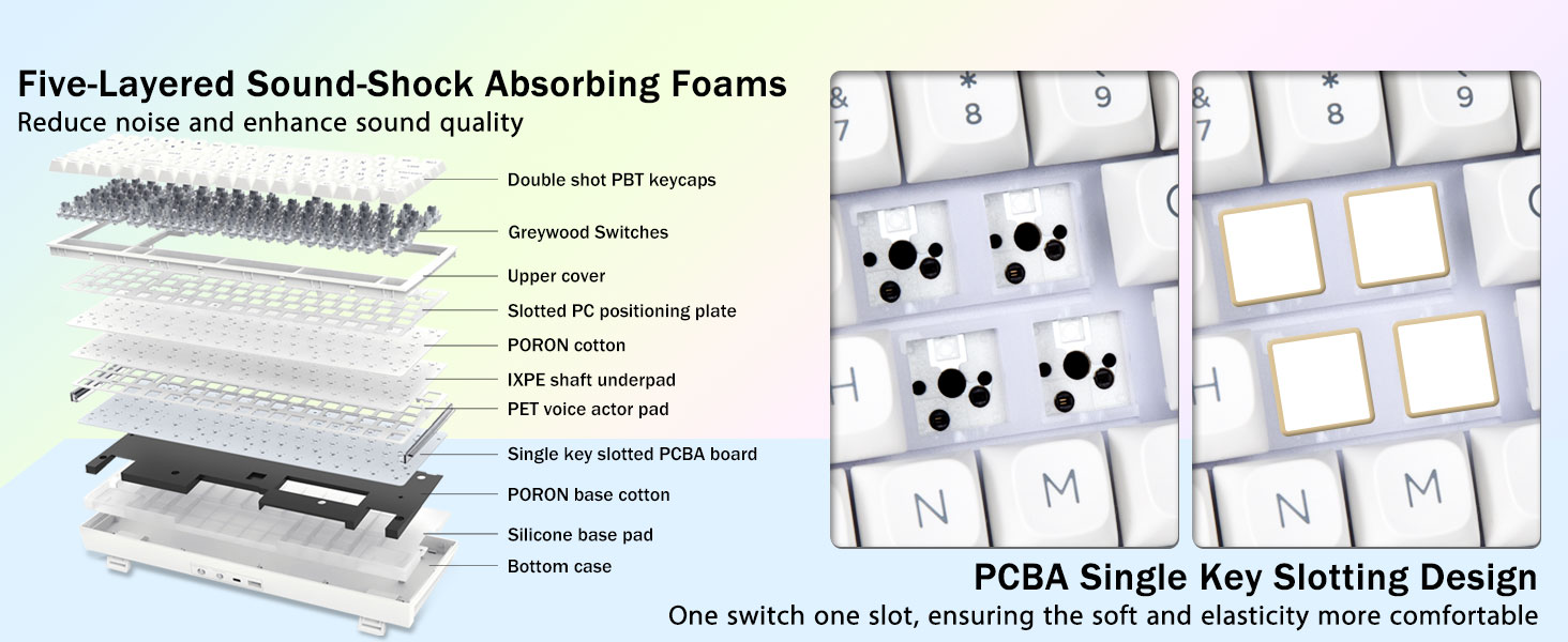 Þéttingaruppbygging og PCB einn lykla rauf:Þetta tölvulyklaborð er með þéttingarbyggingu, útbreiddan samþættan sílikonpúða og PCB stakan lykla rifa, hámarkar seiglu og stöðugleika betur, sem gerir höndina mýkri og teygjanlegri. Fimm lög af áfyllingardeyfi fylla bilið á milli PCB, staðsetningarplötu og skafts, sem vinnur á áhrifaríkan hátt á móti hávaða í holrúmi sem skaftið hittir á staðsetningarplötuna og gefur trausta tilfinningu.