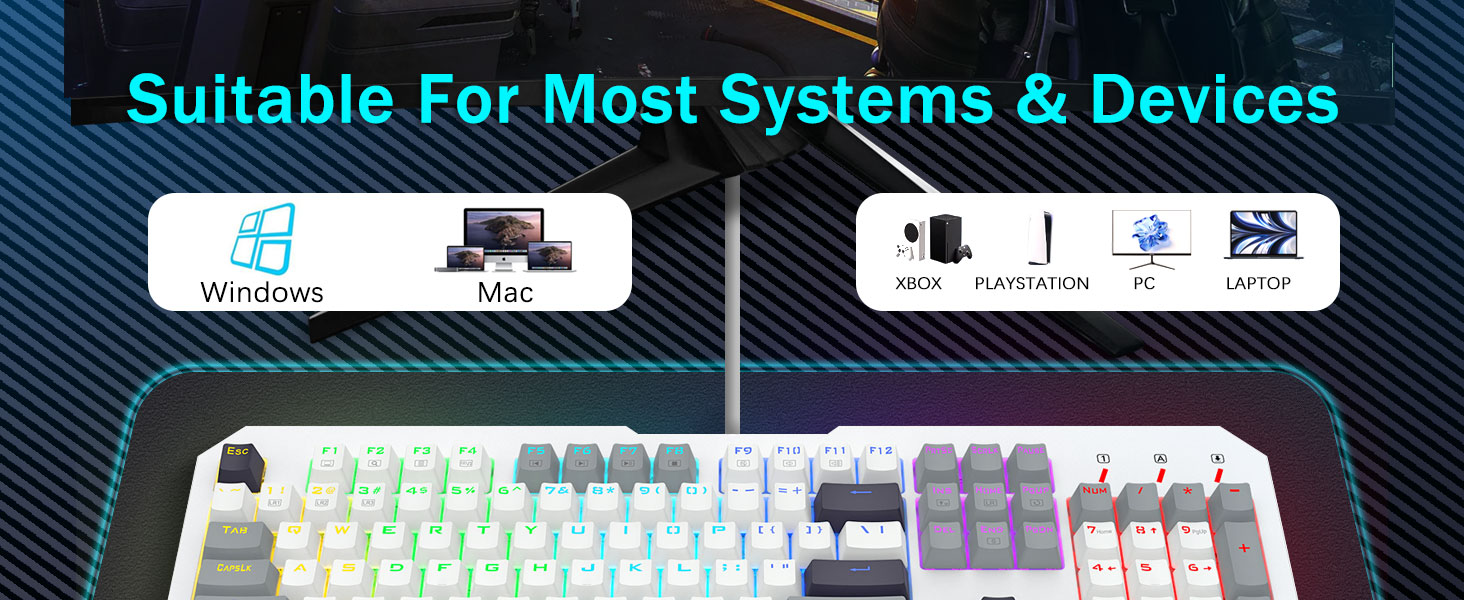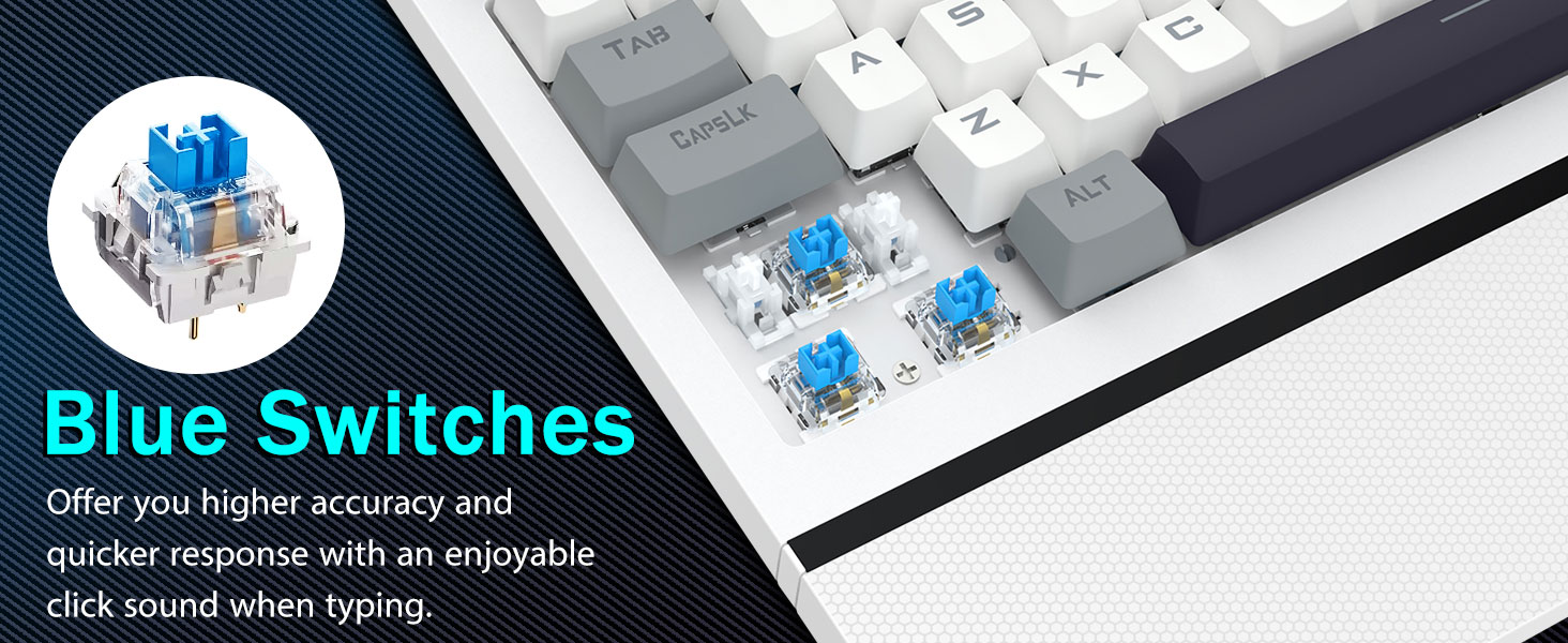 【Rainbow baklýst lyklaborð fyrir yfirgripsmikla upplifun】PC lyklaborðið okkar er með smellandi bláum rofum sem veita eldingar - skjótan viðbragðstíma og ótrúlega nákvæmni. Hver ásláttur gefur frá sér ánægjulegt smellhljóð sem eykur innsláttarupplifun þína. Með dýpri takkaferðum, sterkari endurgjöf og breiðari takkabili er innslátturinn ekki aðeins nákvæmari heldur einnig mun þægilegri. Ef þú ert aðdáandi þessarar áþreifanlegu, „smellu“ tilfinningu, þá er lyklaborðið okkar hið fullkomna val fyrir þig.