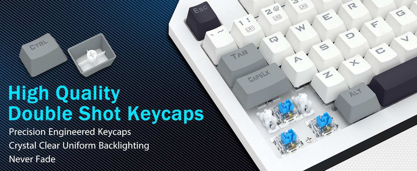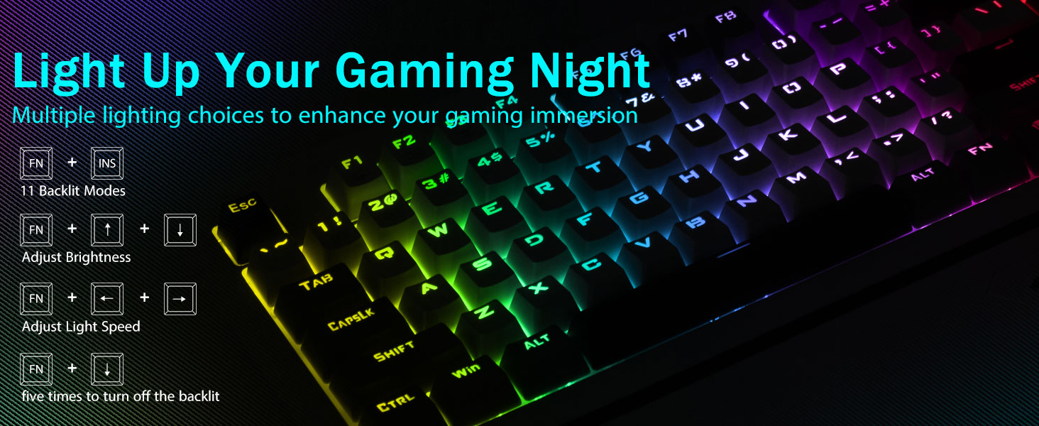【Rainbow baklýst lyklaborð fyrir yfirgripsmikla upplifun】Lýstu upp skjáborðið þitt með 11 kraftmiklum baklýsingu, 5 stillanlegum hraða- og birtustigum. Þetta lyklaborð breytir leikjauppsetningu þinni, eykur skap þitt og niðurdýfu, sérstaklega í lítilli birtu. Ofurþolin tvöfalda innspýting ABS lyklalokin tryggja kristaltæra, einsleita baklýsingu, sem bætir innsláttarnákvæmni þína jafnvel í myrkri.
