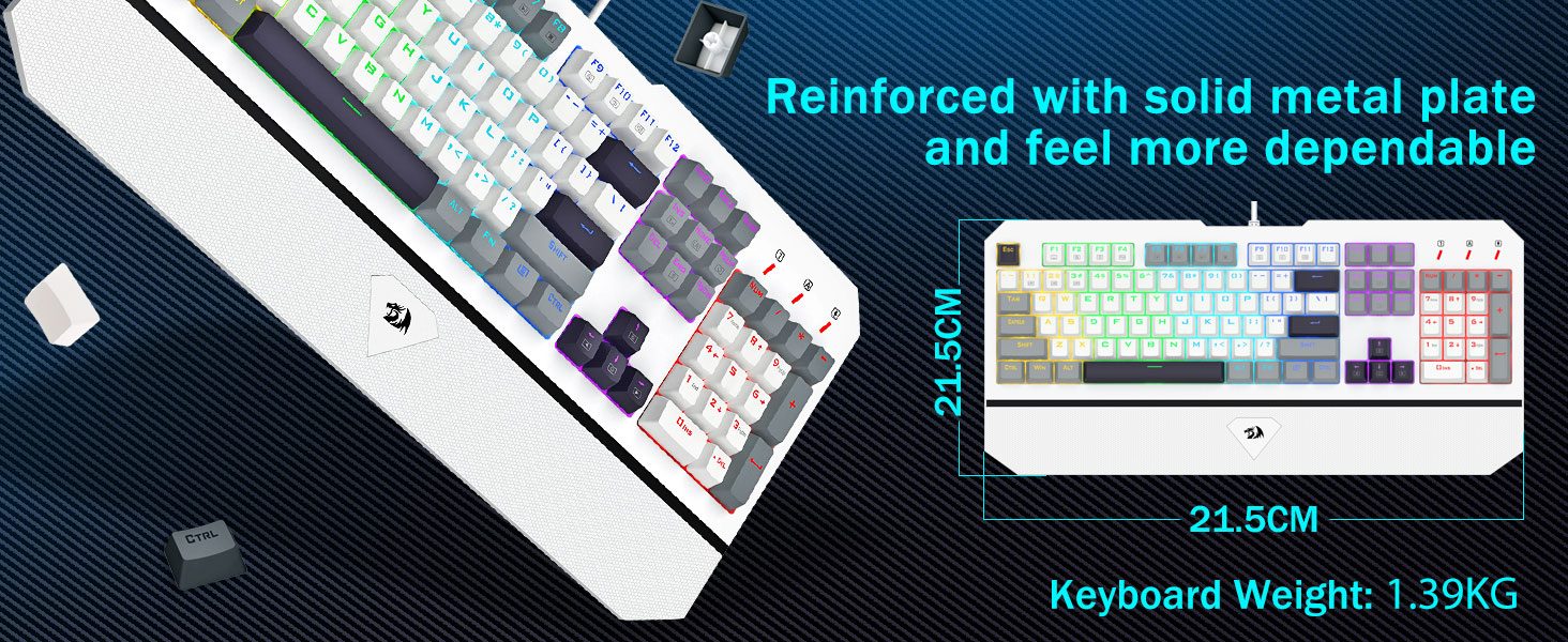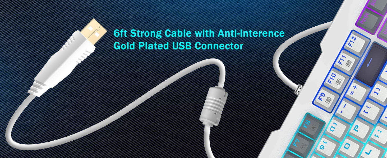 【Hágað 104 lykla lyklaborð í fullri stærð】Lyklaborðsborðið er búið til úr hágæða málmblöndu og ABS efni og er einstaklega traustur, ónæmur fyrir rispum. Gullhúðað USB-tengi tryggir stöðuga, áreiðanlega tengingu fyrir fullkominn leikjaafköst. Þetta lyklaborð, sem vegur 1,39 kg, líður eins og traustum tanki í höndum þínum, sem veitir óviðjafnanlegan stöðugleika við notkun.