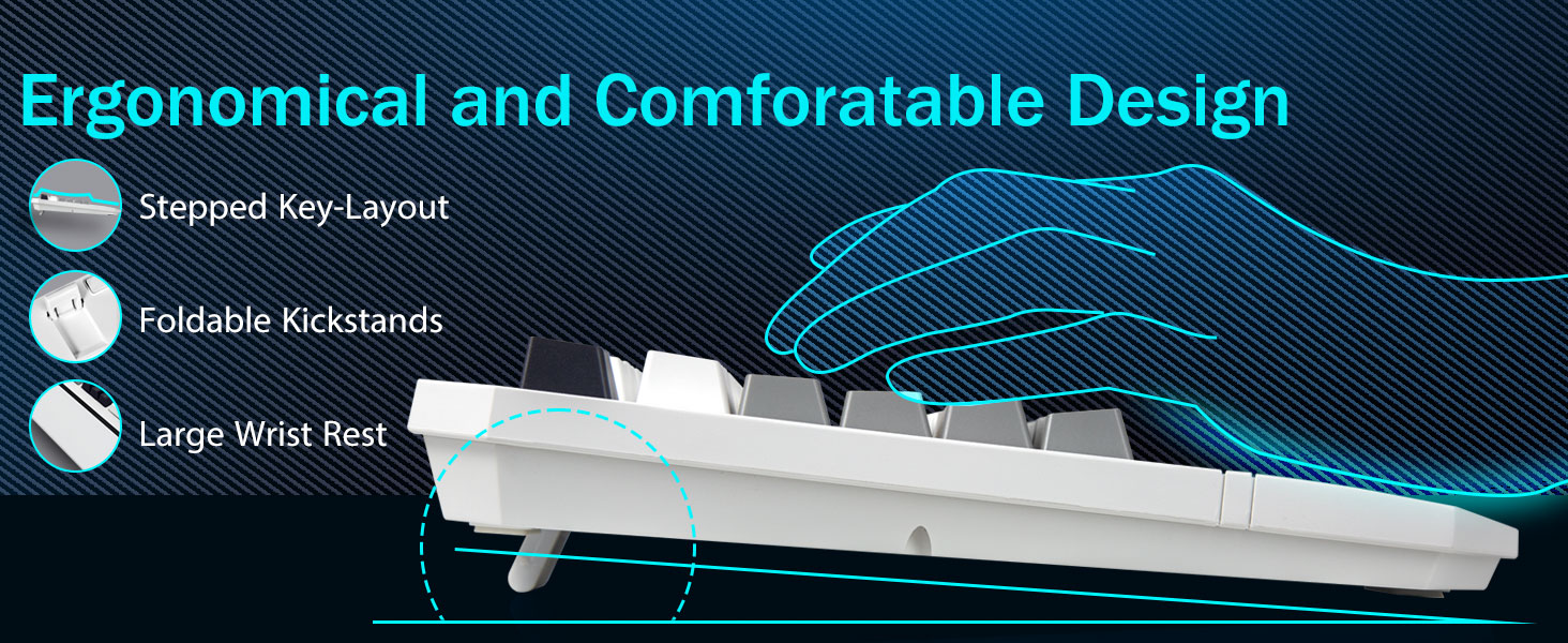 【Íþróuð vinnuvistfræði fyrir þægindi allan daginn】Hannað með þægindi þín í huga, tölvuleikjalyklaborðið okkar er með vísindalegu uppsetningu lykla og rúmgóða úlnliðsstoð. Þessi uppsetning heldur handleggjunum þínum í náttúrulegri stöðu og dregur úr þreytu handa við langvarandi notkun. Lyklaborðið með snúru kemur einnig með 2 traustum, samanbrjótanlegum bakstöngum að aftan, sem gerir þér kleift að stilla hallann fyrir bestu líkamsstöðu.