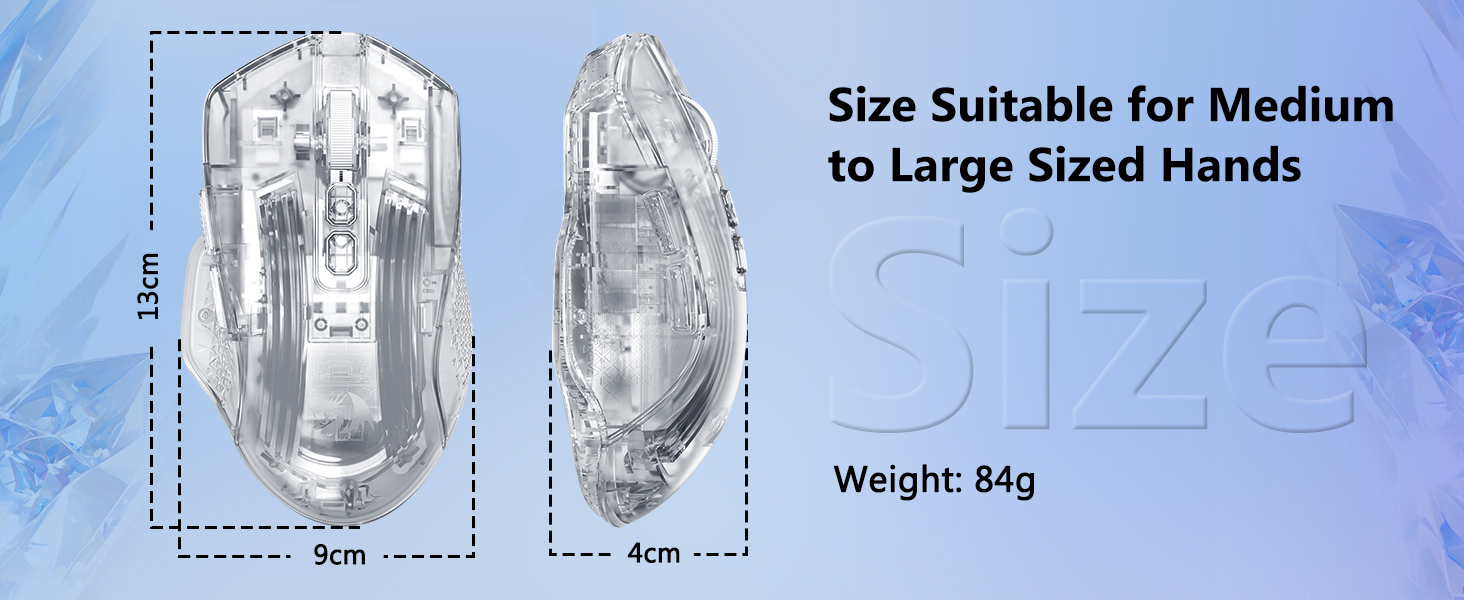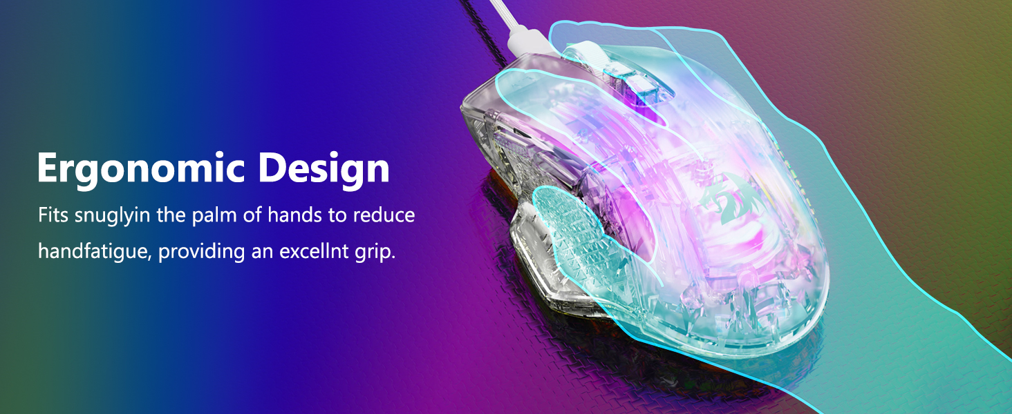 Músin er í laginu þannig að hún liggi náttúrulega í hendinni og styður við langvarandi notkun án þess að álag sé of mikið. Uppbygging þess gerir ráð fyrir þægilegum gripstílum, þar á meðal lófa, kló og fingurgóma.
