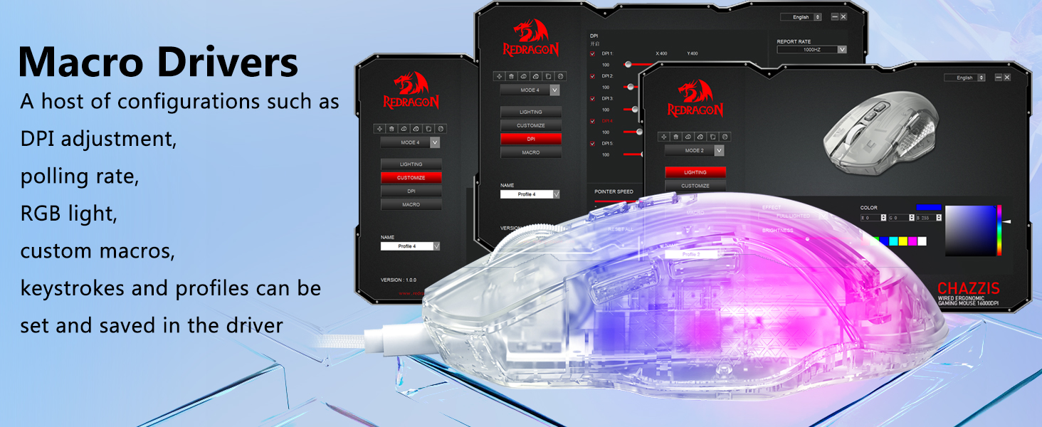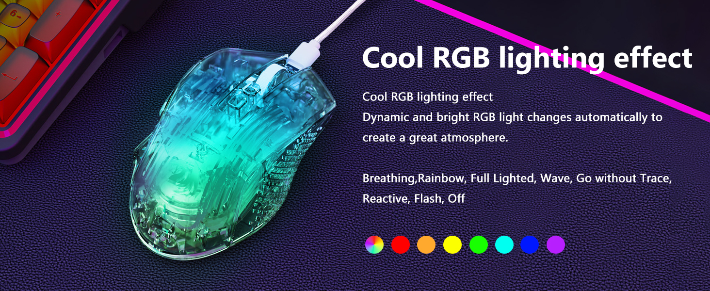 Músin inniheldur átta RGB lýsingaráhrif sem auka sjónræna aðdráttarafl án þess að hafa áhrif á frammistöðu. Notendur geta skipt á milli ljósastillinga til að passa uppsetningu þeirra eða persónulegu vali.