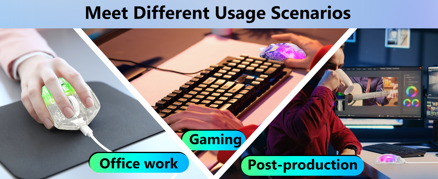 Músin hentar fyrir ýmsar leikjategundir, þar á meðal fyrstu persónu skotleiki, herkænskuleiki og hlutverkaleiki. Nákvæmni þess og svörun hjálpar til við að bæta stjórn og viðbragðstíma.